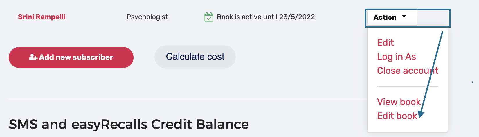 Once you have logged in, the first thing is choosing the practitioner you wish to edit. Scroll down to the practitioner you want to edit and right-click of their name, you will see a button marked “Action”. Click on the button and choose “Edit Book” from the drop-down menu. This will take you to the Edit Appointment Book.