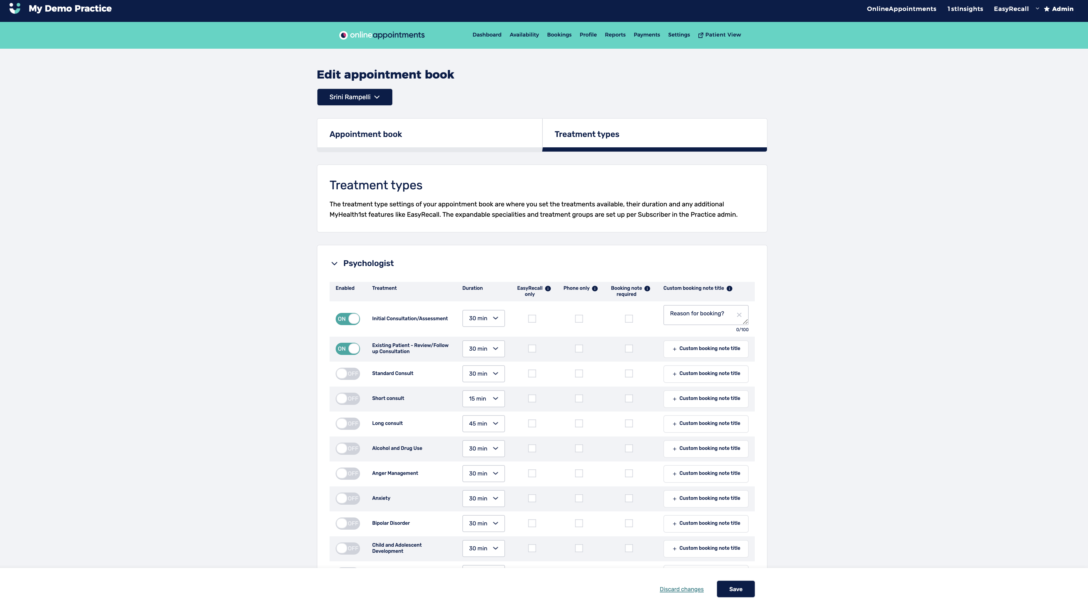 By default, treatment types & durations for practitioners have been configured from details provided by the practice during the initial setup process.
