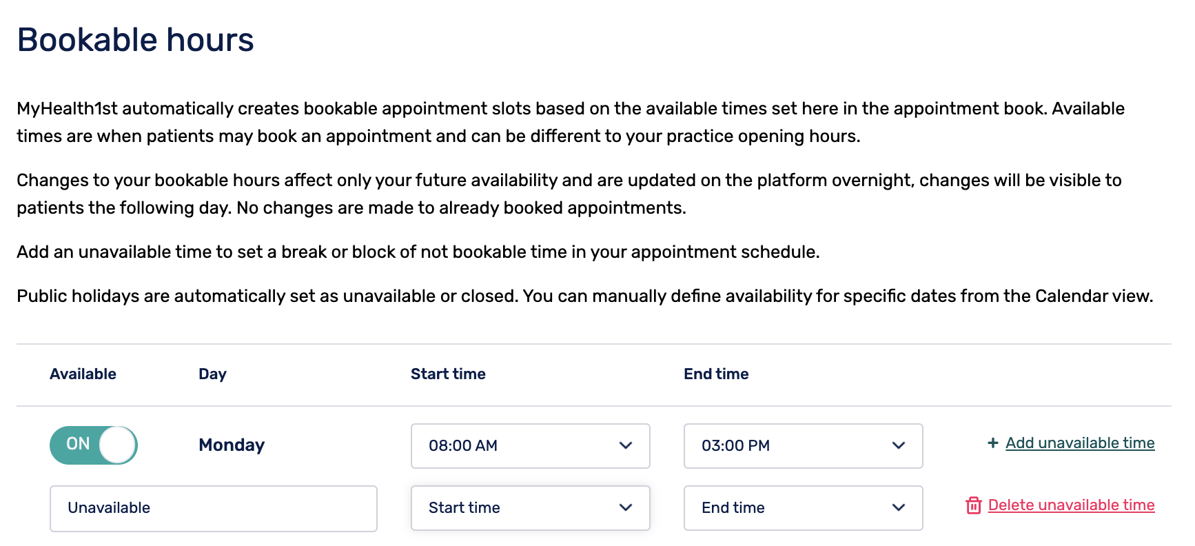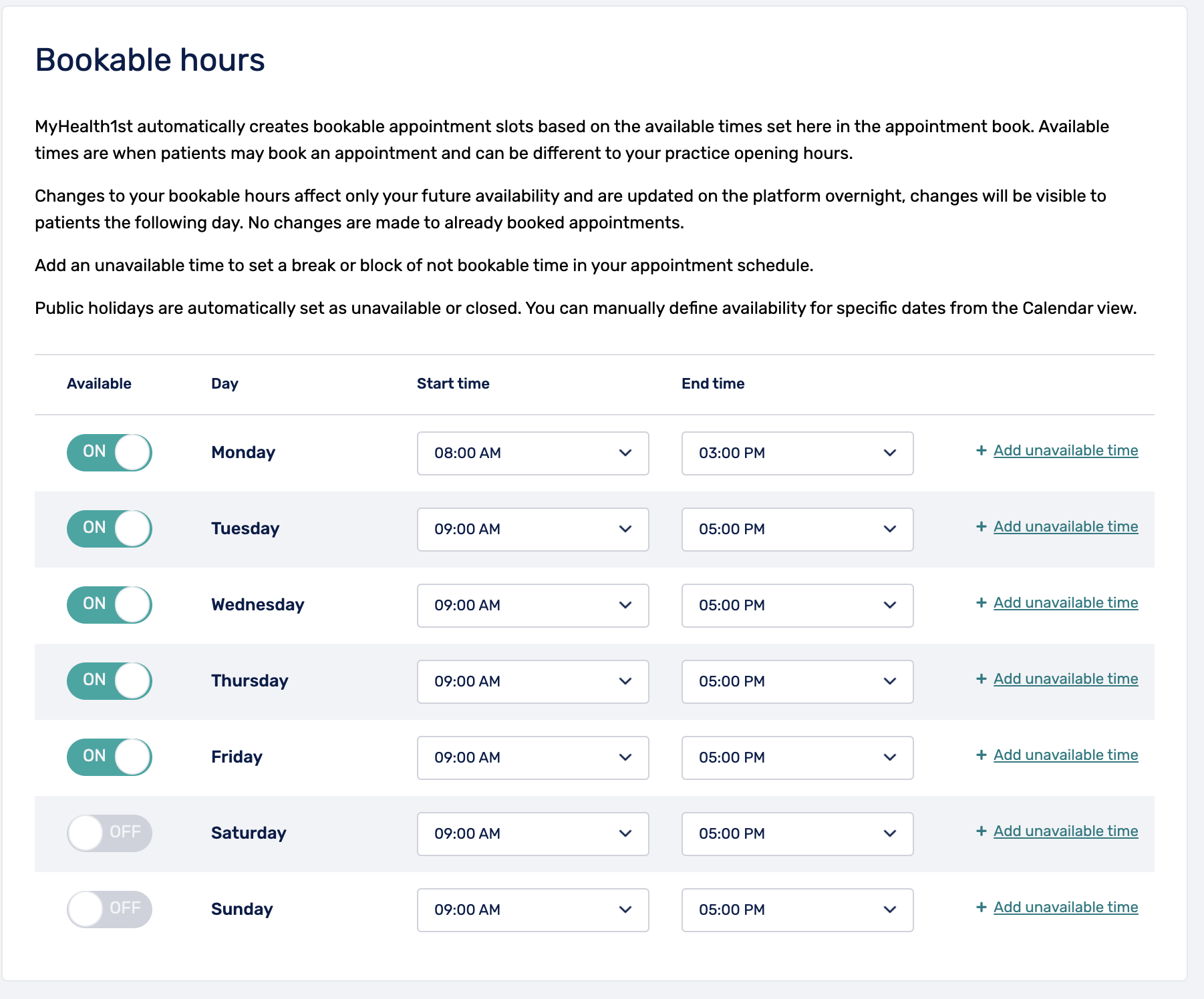 The bookable hours menu allows a practice or practitioner to set which days of the week they are available as well as opening and closing hours.
