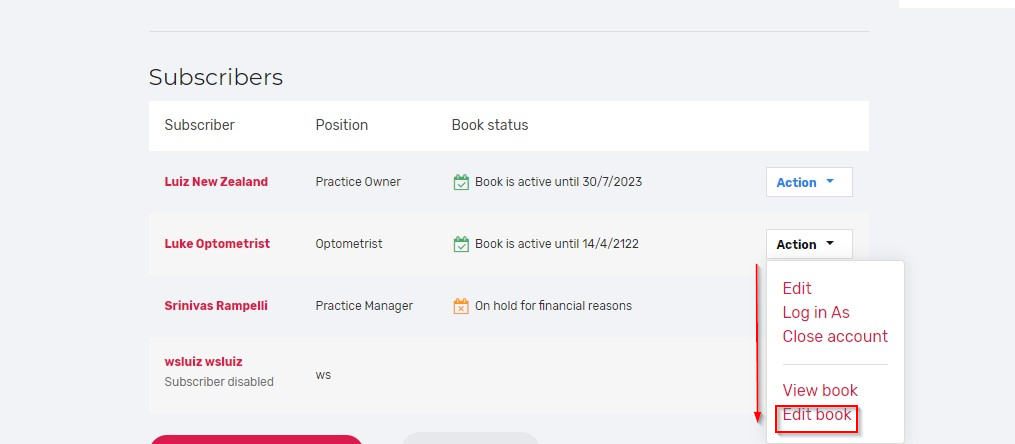 Once you have logged in, choose the practitioner diary you wish to edit . To the right of their name, you will see a button marked “Action” Click on the button and choose “Edit Book” from the drop-down menu.