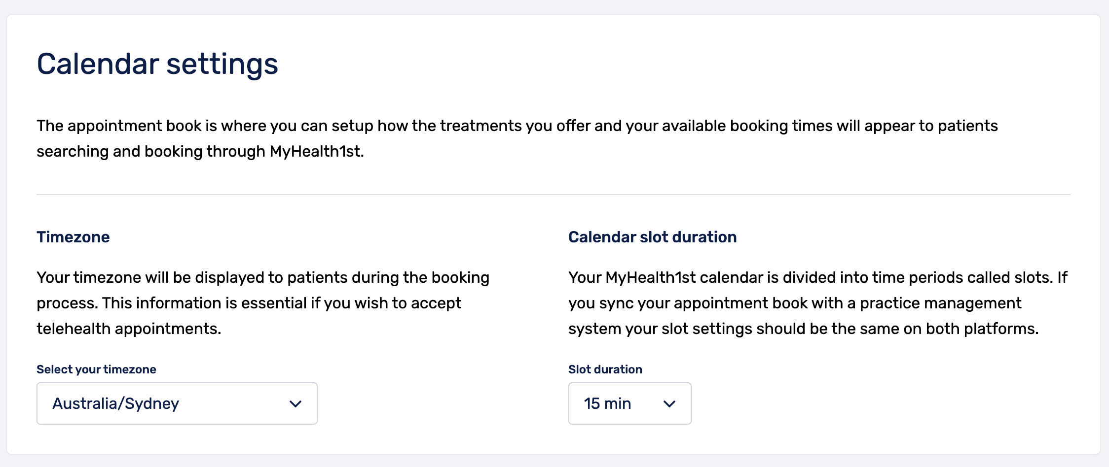 Timezone This menu allows you to set the timezone for your practitioner . Having the correct timezone ensures that online bookings are set to your practitioner timezone.