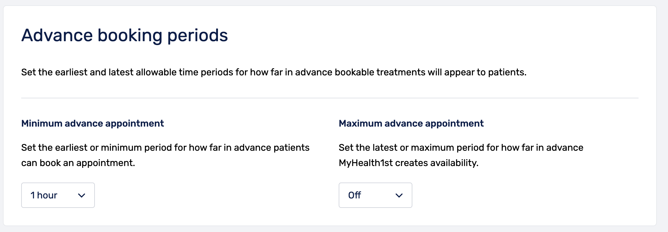 This menu allows a practice to set the minimum amount of time a patient can book in advance. Setting a minimum advance appointment time allows a practice to reduce the chance of having last minute bookings.