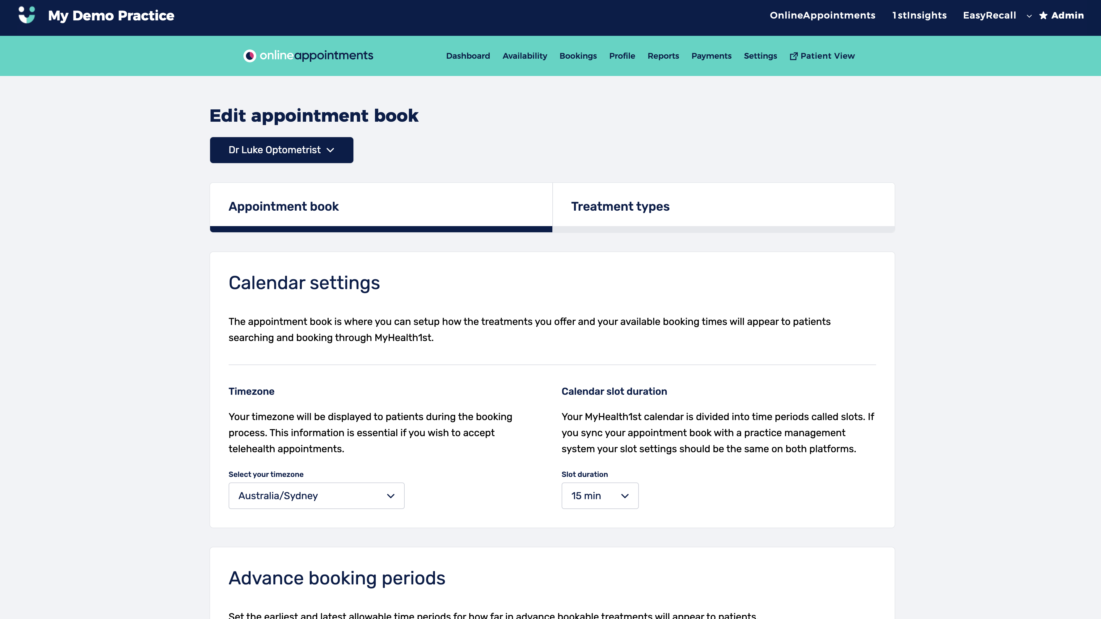 This will take you to the Appointment Book Page . Here you can set up availability as well as treatment types if needed.