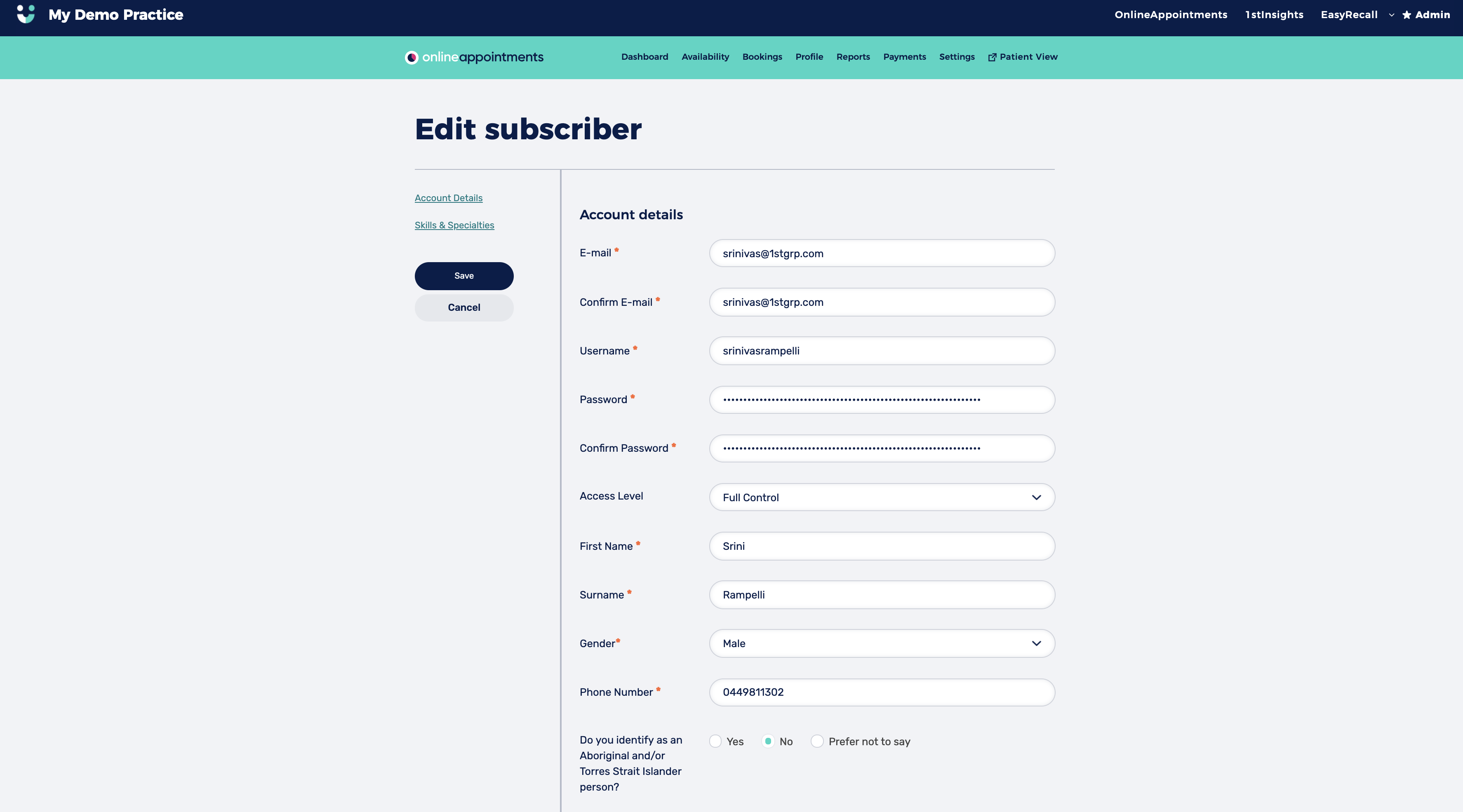 The subscriber page is where all practitioner details should be entered, from the most basic, such as name, gender and phone number, through to more specific details, such as specialisations and skills.