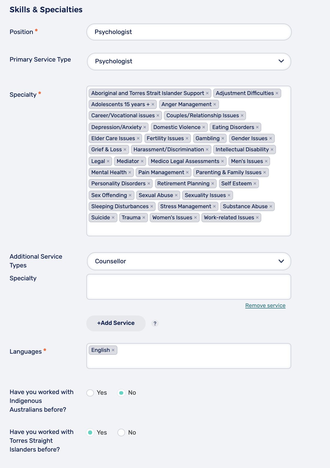 Skills & Specialties Listing all the skills and specialities of a practitioner not only helps differentiate them from others, it also makes them more likely to be found in online searches. In this section you should answer the following mandatory fields: