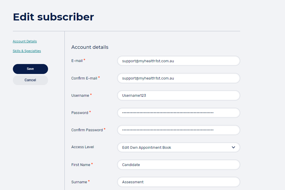 When making changes to any of these fields, select SAVE to apply. You can either create a new password for each practitioner, or provide them with their username, which they can enter in the RESET PASSWORD page HERE . If you choose the latter, a password reset email will be sent to the email address included in the E-mail field above.