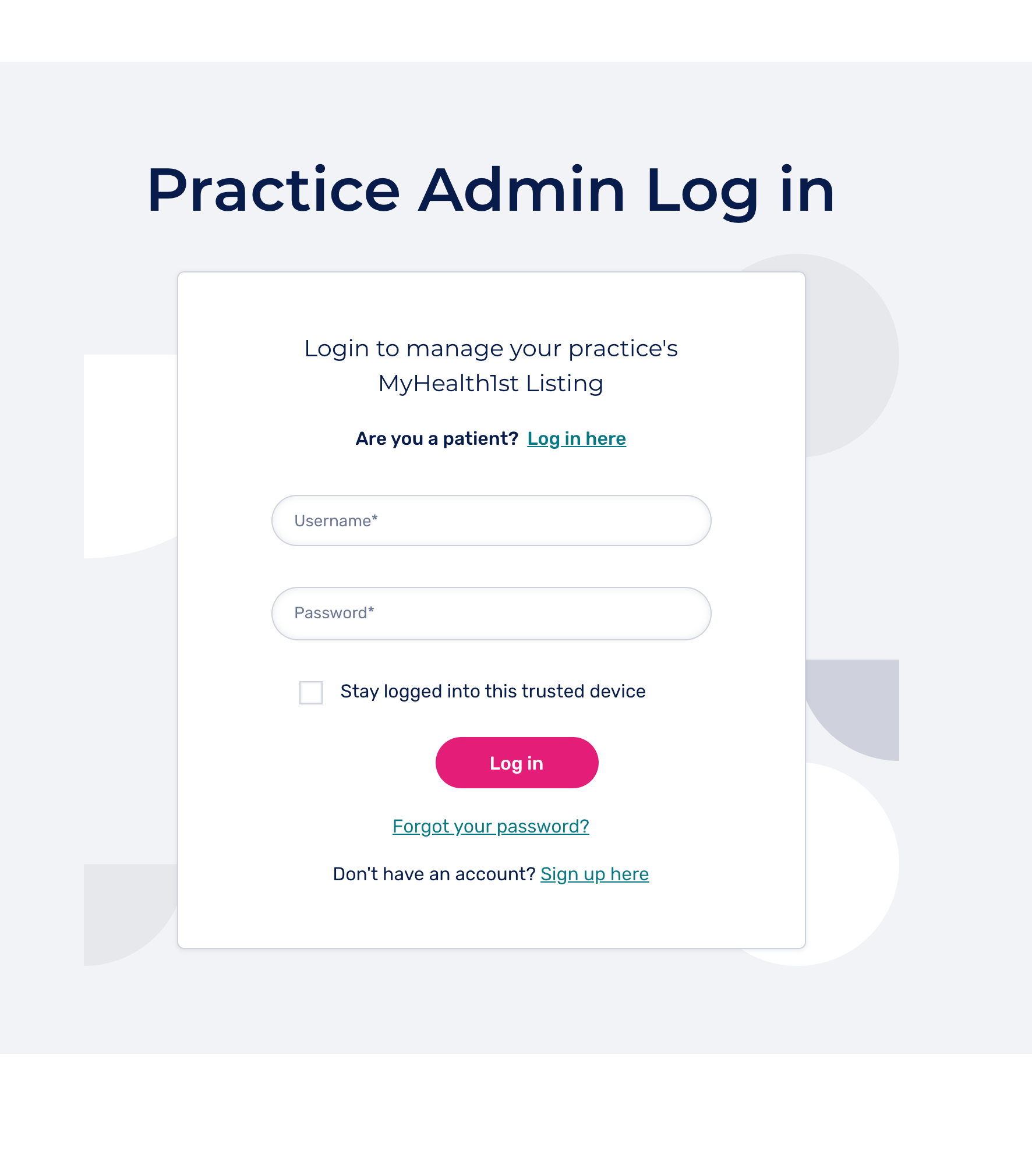 In the Practice Admin Log In page, enter your MyHealth1st username and password, then select Log In .